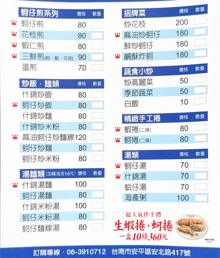 主要提供蚵仔煎、蚵仔炒飯、蚵仔炒麵
